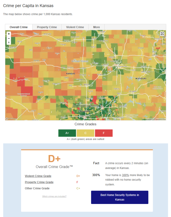 What is misleading about that is that certain “crimes” are not pursued or prosecuted. IOW, they are not considered crimes, just collateral occurrences associated with a more balanced and equitable society. I’m talking about gangs walking into a retail source and robbing it in plain sight and walking out. Nobody has recourse in that situation. It continues to happen and places shut down.Decided to see how the crime rate in Kansas compares to SF, for no reason in particular (CrimeGrade.org):