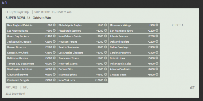 Current SB odds at Bovada. Also the early line is the Rams 1.5 point favorite week 1 @Oakland.
