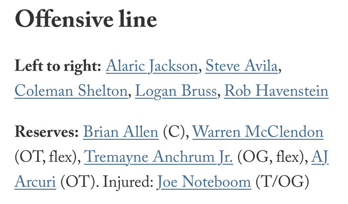 You can really see the plan looking at how they allocated draft picks and UDFAs. Let’s keep building but plenty should stick once we are down to the full and practice squadsIt might be a little off, but it has every player plus has them at the right positions. For example I doubt Jason Taylor II is going to be the return guy, however, there is no other depth chart that is 100% accurate including the Rams website, which is never correct Ourlads is the best one I have come across.