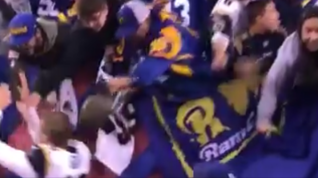 Pic #1, just before the crime: He's the guy wearing Number 22 Rams jersey and a white and blue Rams cap.