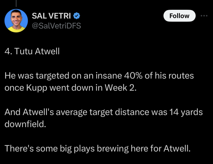 Maybe Mcvay will try to play to his strengths and try to use him he really has no choice … if he’s this guru he should be able to scheme up some plays to get tutu ball in space to use speedAll I’m seeing on here is a bunch of hoping and wishing. Tutu has never been a consistent fit in this offense. He will remain a backup until he’s gone.