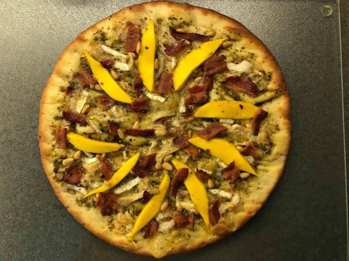 -thin crust, a skim of basil pesto, top with chunks of mango, red onion, brie, bacon ( or chicken ), pine nuts ( lightly toasted in oven before hand ).