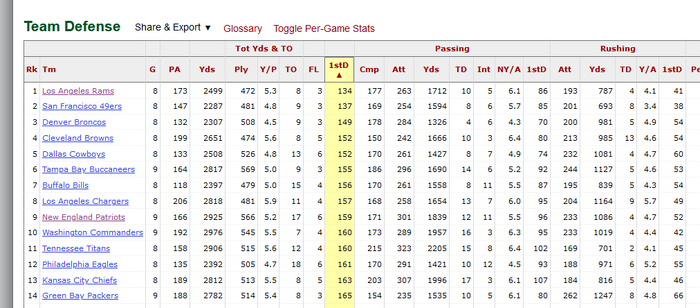 A snip showing the Rams D has given up the fewest first downs in the NFL? The 11th fewest passing yards in the NFL? I thought teams passed all over us for first down after first down. Seventh fewest passing first downs in the NFL.