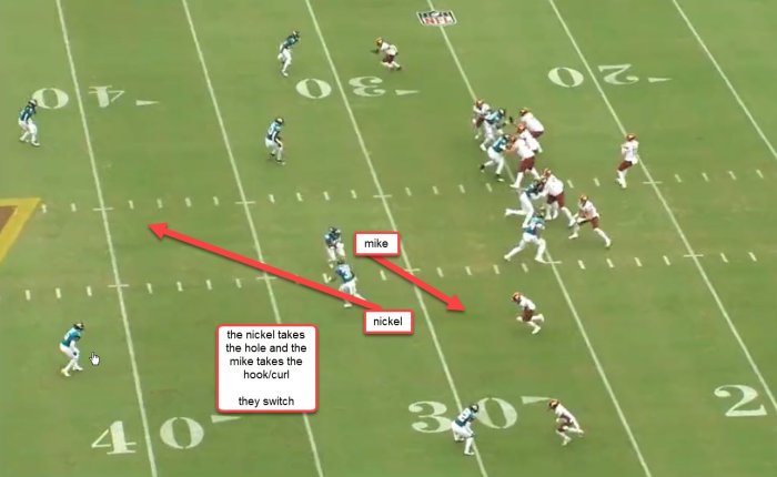 Here is a partially inverted Tampa-2 ... usually it is 2 safeties taking the deep half and the MIKE (or any linebacker can do it) drops to the hole, the shot middle ... not as deep as the safeties by deeper than the LBers and CB