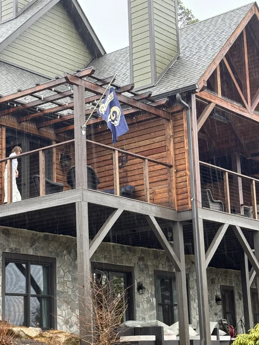 Update: After some initial saltiness, the neighbor has agreed that the flag stays up until the Rams next loss. Long may it fly.It’s one thing to put a Rams flag up at your house in a neighborhood full of Carolina fans. It’s quite another to convince a neighbor’s wife to secretly put up your Rams flag on his house while he is on the treadmill in the basement.