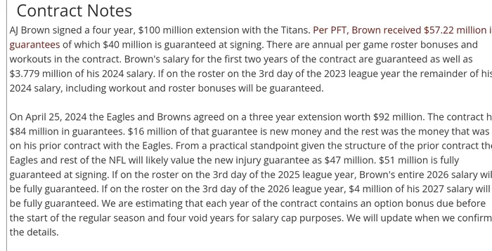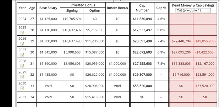 I read the option bonus as being prorated as if it's been paid already and is just avged in across the contract. Of course these deals are confusing. Not sure what the difference between a prorated option bonus and a prorated bonus, unless that is guarantees he earned each year on the deal up to that point. I know in Philly the radio talking heads have been saying that he has no guaranteed money after this year.His 2026 base is is only 1.3 mill but he also has an option Bonus of 27.4 mill which is all guaranteed.