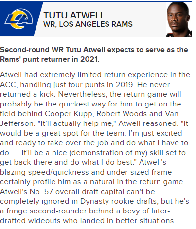 I agree with you on the Rams looking like TuTu's legs @ corner. Snead only signed one UDFA corner Brontae Harris after drafting Robert Rochell, Harris plays outside. The problem is Harris looks like a clone of Dinky Deayon.