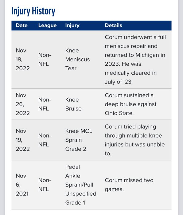 I worry about a lot of things with Corum. Mileage, injury history, size, etc. I don't know about this pick. The more I look it up, the more concerned I am. His character is impeccable, but I question this selection, especially with a third-round pick.