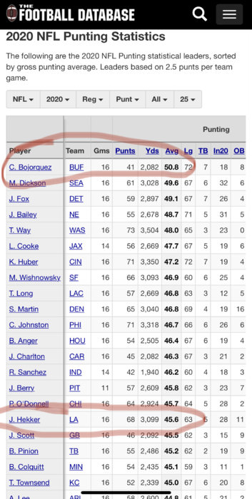 In 2020 Hekker was the 17th ranked punter on a horrendous 30th ranked special teams unit that transitioned the ST coach ASAP when the season ended while Bojórquez ranked first in net punting yards on an 8th ranked Bills team.