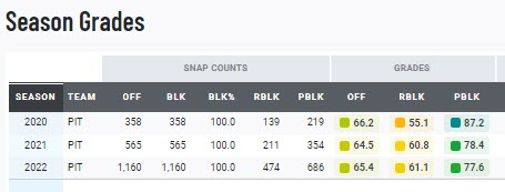 Kevin Dotson’s time in Pittsburgh amounts to almost 1,000 snaps of action now across two seasons, and his pass protection has been elite over that time (aided by Ben Roethlisberger’s league-fastest average time to throw). Conversely, he has PFF run-blocking grades of 55.1 and then 60.8 on his resume.
