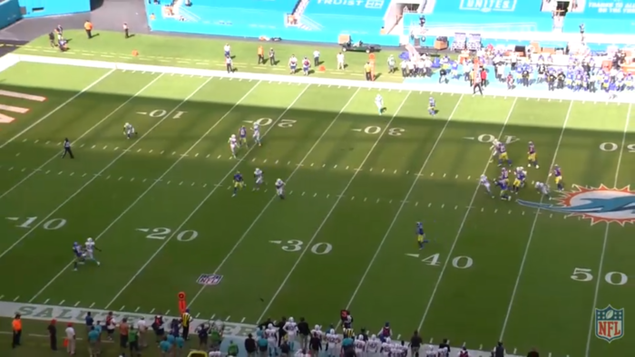 Pre-snap Phins showing cover 2. Left safety has deep responsibility (Jones bottom screen is on an island) and right safety will team up with 52 to double Kupp