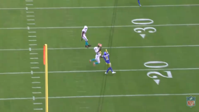 Goff misses a bit behind, the DB tries to haul the pass in but drops it. Note Reynolds as usual not providing any sort of aggression to the ball.