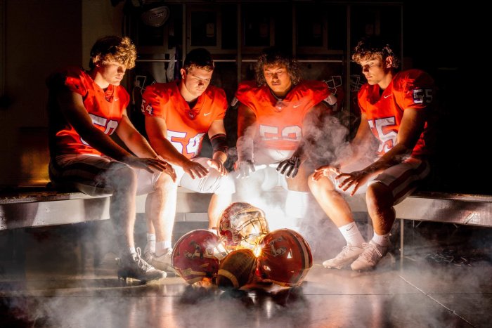 My wife likes to do sports photography. She shot this one in the field house next to the stadium. It’s our defensive line. Lincoln is #54