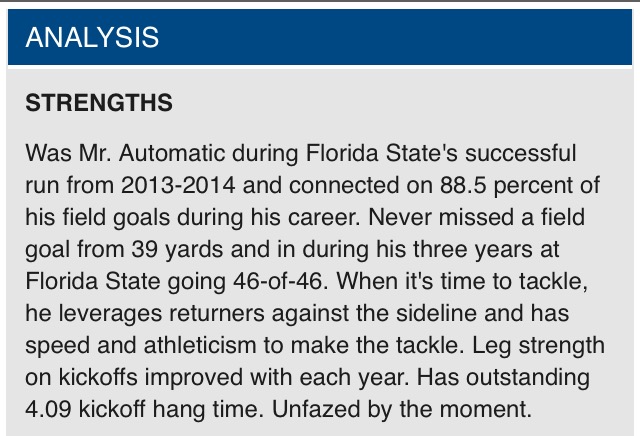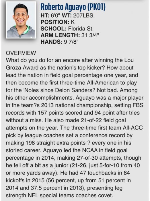 With the 133rd pick of the ROD Mock Draft, the San Francisco 49ers pick K Roberto Aguayo. With TE Adams getting taken a couple spots before us, we decide to fill a hole on the team with the nations top kicker. Typically a fourth is high for a kicker. But he's well worth the selection View attachment 12970 View attachment 12971