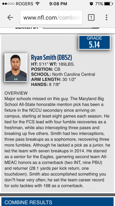 Solid. I have about 5 o lineman left on my list at great value but I already drafted two. So instead, I'm gonna go ahead and take a different route. The 9ers need corner help. So with the last pick the 9ers hold, we select CB Ryan Smith North Carolina Central. If he's good enough to meet with the Rams, he's worth stealing late.