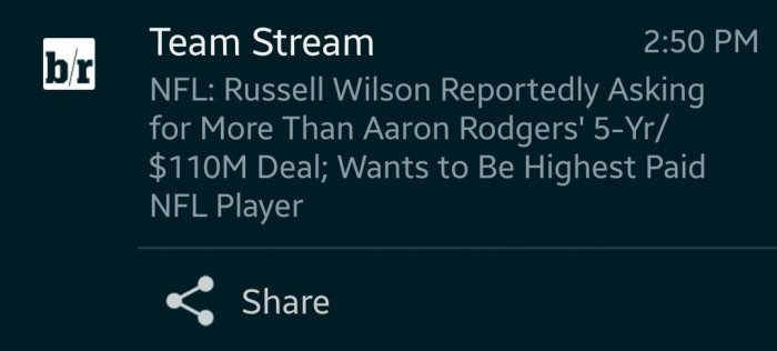But they could be there by February. If ongoing discussions (discussions that could be continuing as soon as this week) fail to result in a long-term deal, the Seahawks could opt for a trade of Wilson over mere placement of the non-exclusive tender and acceptance of a pair of first-round picks from whichever team convinces Wilson to sign.