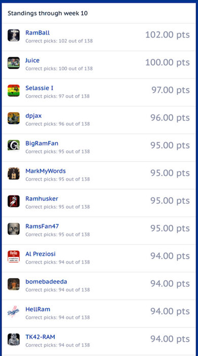 Pick’em Standings through Week 10. Lots of separation and this board has been moving around week to week.