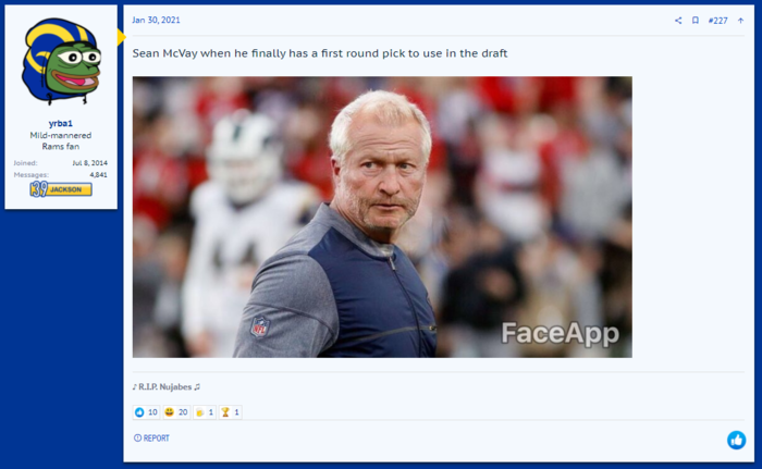 I've made plenty of mistakes trying to predict what will happen to our Rams... but so far, I've been vindicated in my instinct to trust that McVay and Snead are smart and capable and know what the F they're doing. I was one of the few posters who did NOT trash the Stafford trade. (And yeah, I was ready to move on from Goff at the time of the trade.)