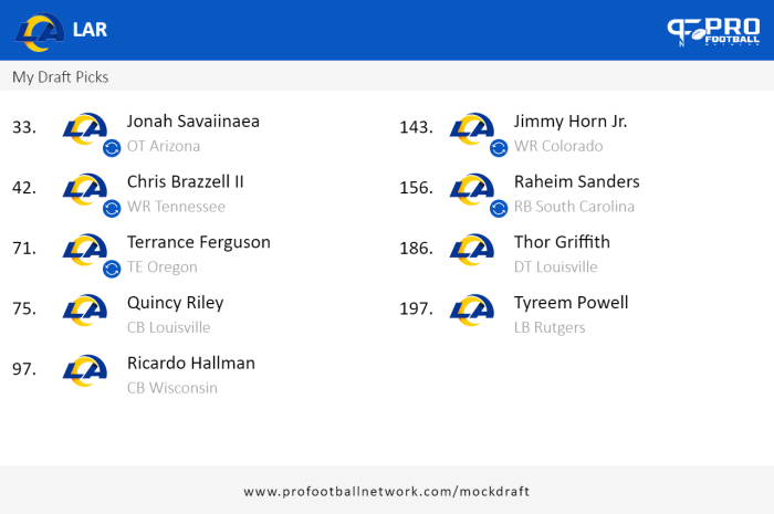 Love the Sanders and Griffith picks. Jimmy Horn Jr. is highly overrated; I see a seventh-round pick because he's just too slight and isn't that productive.