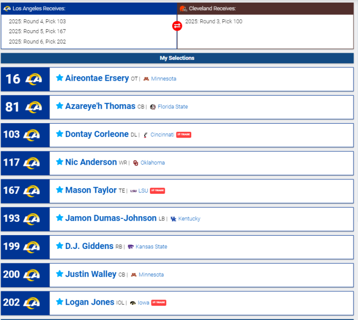 Not a bad draft. I'm starting to think there is good opportunity to trade back in this draft coming up where we will be and pick up some more picks and still get a game breaker like Verse. Some really interesting OT prospects in the late 1st round down to the mid of the 3rd it's looking like. Going to be interesting to see how they shape out going into the Combine.This one may be my favorite of the bunch and a 3rd impact draft in a row trade though is heavy in our favor.