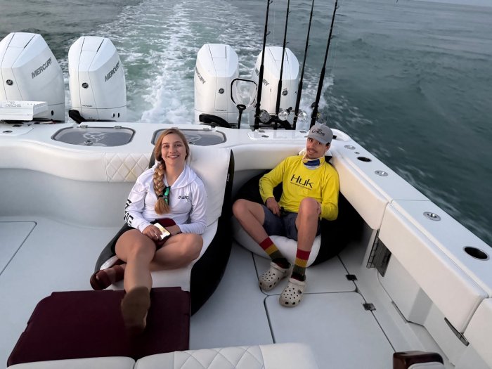 My cat is powered by 2 outboard motors. Some of the bigger ones like the Freemans have 4 and they are beyond badass. In fact, most consider them to be the baddest outboard powered boats on the planet by far. My friend in the Keys took my sons out on his Freeman about 2 weeks ago. They went to the Dry Tortugas from Marathon (160 miles). They got there in under 3 hours. You better have plenty of $ to pay for gas in one like his though. Here's a shot of the motors and the helm on his 52' Freeman. That's one of my twins and his new fiancé chilling in the back.