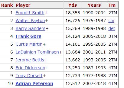Frank Gore is 1,000 yds away from passing Barry Sanders for 3rd all time career rushing yards. Obviously Gore has been active far longer than Sanders' relatively short nine year career but still....i didn't think Gore was anywhere near the top 10.