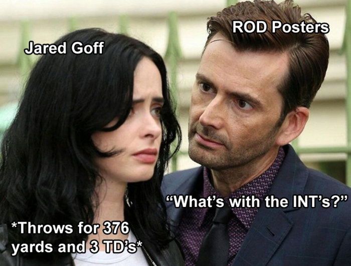 My judgement of Jared Goff is mine alone and maybe totally wrong. Goff is a talented, yet flawed QB. He is streaky, He can be incredible accurate, followed by some boneheaded throw. His critics are unfair to him and are a bit of an echo chamber. They have never forgiven him for not knowing where the sun rises and falls., so they think him stupid. When he does something fantastic, it's solely because of McVay. When something goes wrong, it's all on him.
