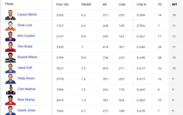 BTW, just for perspective here's the top 10 QBs with the most picks so far.