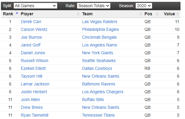 So when you list out raw numbers, he's not THAT far off from the median. But the issue is that all come in short periods of time, sometimes in back to back drives. They're too frequent. Those other players have them sporadically throughout the season. Most of them (Carson Wentz not withstanding).