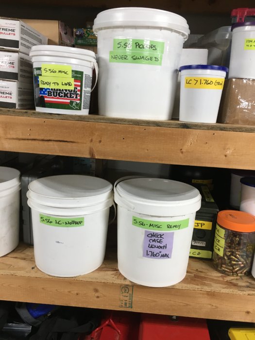 When I started reloading 5.56 I bought 1000 once-fired military Lake City brass cases. So they all needed swaging. This is the process I use and also use it for all range pickup brass. I try to collect all the brass I shoot, so I know which ones have been swaged. I have a bunch of different buckets to keep my brass straight and know which ones need what prep. I keep the Lake City brass separate because that is what I am currently using for my "precision" rounds. Misc brass and range pickups are for plinking rounds.
