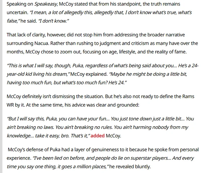 This all seems like fake nonsense, but it's beyond time for Puka to learn. He seems to be getting real close to crossing the line from an enthusiastic and likable young kid to an immature attention seeker who puts himself in stupid situations. It's fine to party, but party with people you trust. Get an agent who checks the background of podcasters before you go on and listen to their advice. Slow down. Right now his impulsiveness just makes him an easy target and this crap will continue unless he learns from it.
