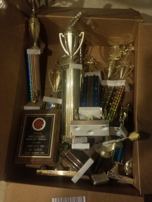 just gave you 1 more to add to your collection.Wife used to play also, but not as often as I did. I was on 4 leagues a week and a drop in blind draw doubles tourney every other Saturday night. But that was 20+ years ago. Don't play that often anymore, maybe once a month at my buddy's house. Here is the last box of trophies from the good old days. Lol With the wife home all day she decided to organize the basement. All her crap gets moved around and all mine gets tossed in the dumpsterView attachment 36074