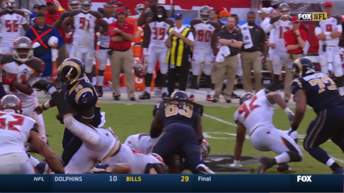First drive of the 3rd quarter, the Rams offense is really moving, having gone 37 yards in 5 plays. Zac Stacey takes a run up the middle but fumbles on what looks like very little contact. So what happened?