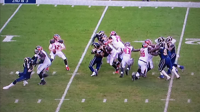 The play right before the Dunbar roughing the passer was a perfect (and blatant) example. See screen print below. It's better to see with live action so you can see how Quinn's progress is impeded (and I haven't figured out how to do that), but Quinn has a clear path to the QB, except that the OL has BOTH ARMS WRAPPED TOTALLY AROUND HIM FROM BEHIND like a toddler trying to stop his mom from leaving him at day care.