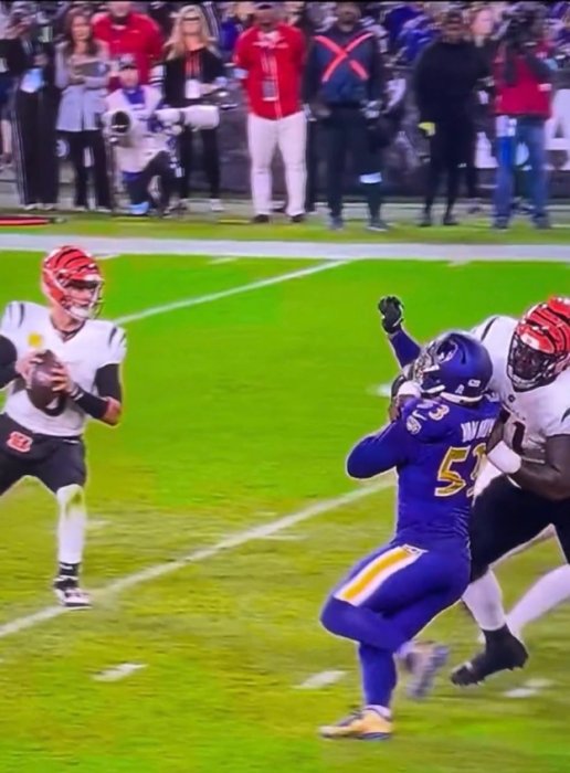 While complaining about Burrow getting hit on the head, they completely ignore the hold by the lineman which caused it.