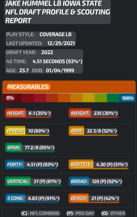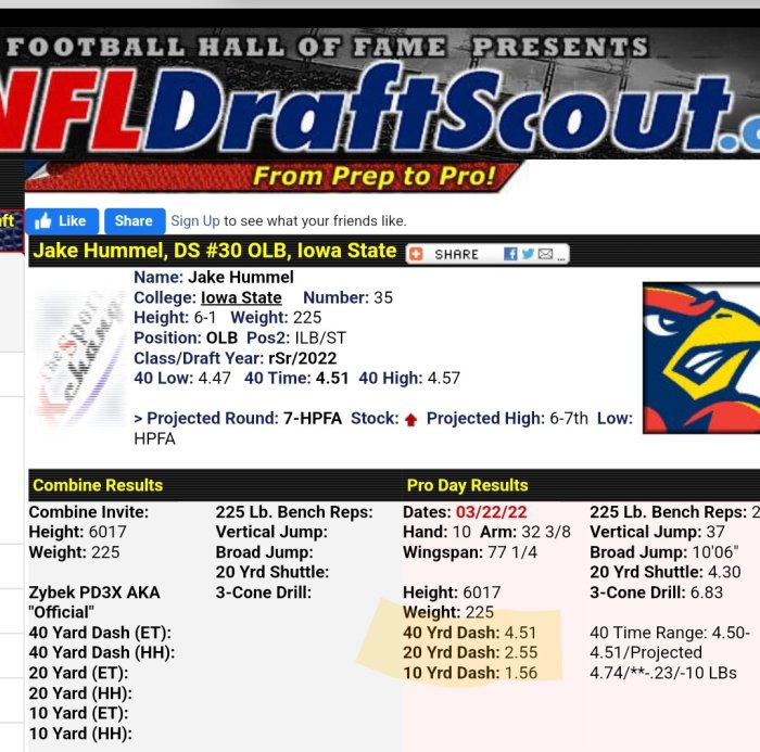 BTW, regarding Hummel...I didn't realize that he ran a 4.51 at his pro day. I understand pro days can be favorable for a players time, but that is still damn good even if it would have been a 4.55 at the combine. Als9 a great 3 cobe drill of 6.83