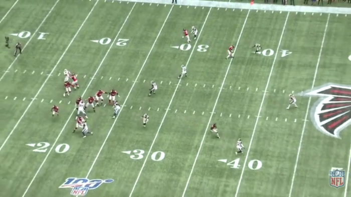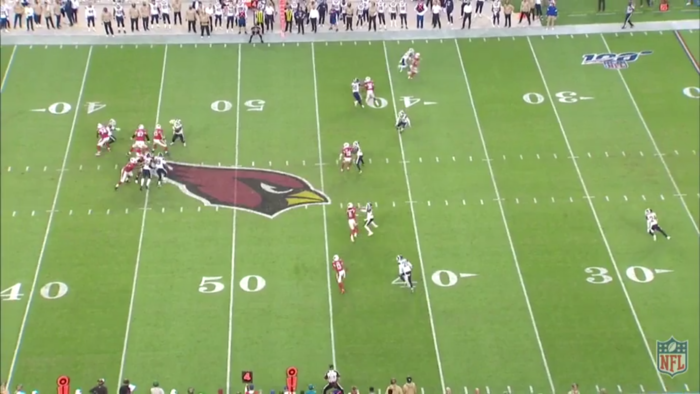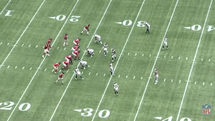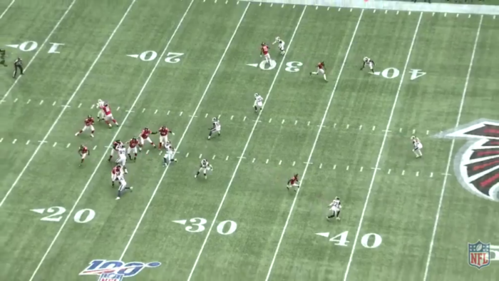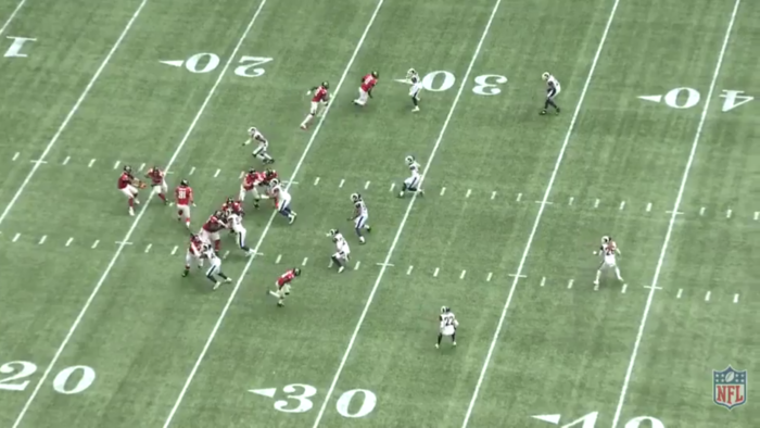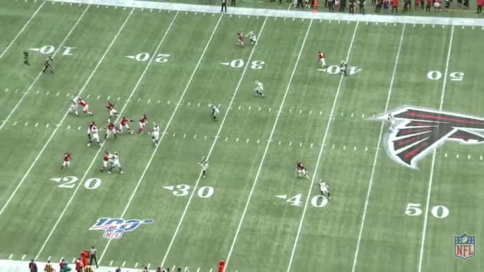 Here we see Hill at the bottom of the screen with his trademark cushion. Christian should have the inside wideout as he's positioned over the top which would allow Hill to focus on the underneath but Hill just looks undecided as the underneath breaks