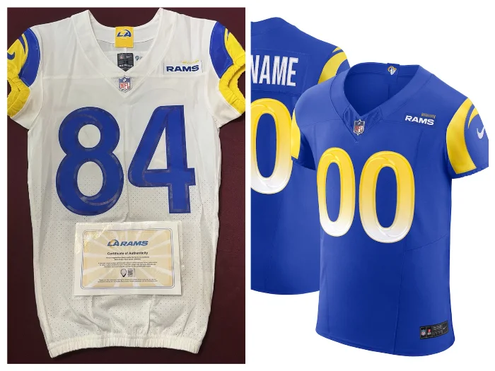 The blue jersey you pictured is a Vapor Elite made in Honduras. Those are nice jerseys but not team issue. The white jersey is a team issue.... I know the difference as I have 10 teams issues jerseys. The team issues are cut in all different lengths in accordance to the individual player requestI just wanna point out, because I see this sometimes. Those $385 jerseys *are not* the same as the team issued jerseys. They are very nice quality, that combines elements from on-field jerseys. But you’ll notice the description online says “For fans who want to get closest to what the players wear on the field.” Keyword is “closest”. If you search for a “game worn” Rams jersey on eBay, you will find that actual team issued jerseys run much longer so they can remain tucked in. The sleeves are almost nonexistent