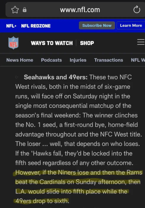 Even if the 49ers lose to Seattle and we beat the Cardinals, we would be tied in the head-to-head matchup (1-1) and tied in the division (4-2). The last tie-breaker would be conference record which the whiners take in a landslide (9-3 vs 7-5).