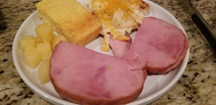 Yes...cornbread! (lol)Wait, is that cornbread? Your wife did a hell of a job; it's not her fault that your tastes are strange, to say the least. Pineapple and ham on a pizza? No thanks.