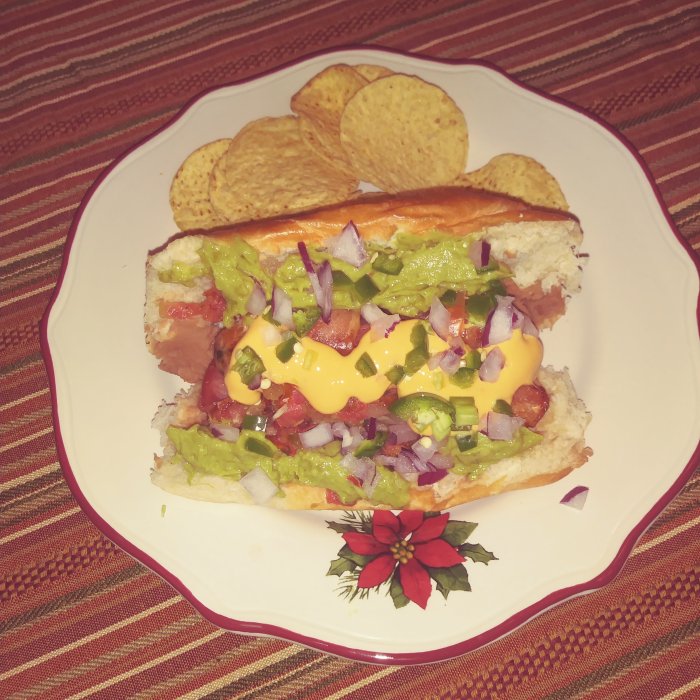 Yep, tho no mustard, and supposed to be pinto beans (we left our cricket at a relative's at Thanksgiving so refried) and sour cream (I used nacho cheese as I do not care for sour cream or Mexican crema).Guacamole, mustard, onions, jalapeños, bacon-wrapped dog?
