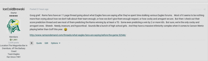 Anyway, like I said...I went to several websites where i could access their main forum and won't even mention the Rams by name, it's like they think they're playing a ghost next week.