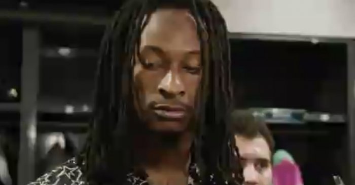 Looks like he always does.IMHO the expression on TG’s face tells me he’s not too happy having to put up with Thiry. TG really looked like he was sick of having to deal with the media during his interview, especially after the Falcons game.
