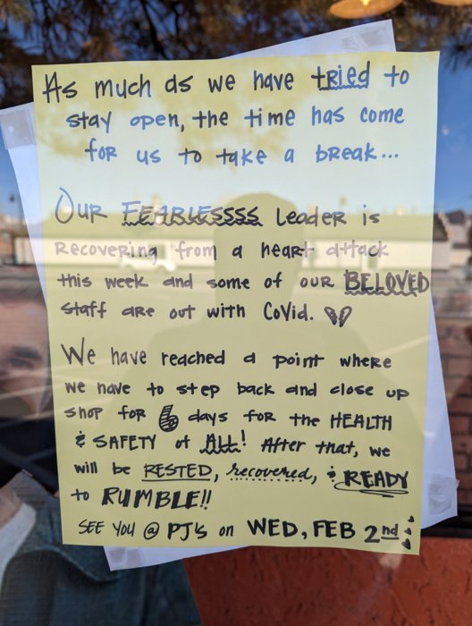 Yeah... It's been tough. I'm in the hiring/firing game and it has been ridiculous for us the last 2 years. I just hope this iconic establishment gets through this and hope good news for the owner.I'm sure you see it as much as me being in the business but yeah this is a common problem. I'm glad BJ's bbq came back from their closure for 2 or 3 weeks. It's so rough right now even getting people to work let alone keeping the ones that want to work healthy and moving forward.