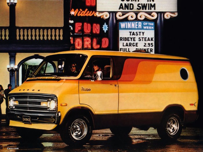 mine was a 77 Dodge Tradesman Van - seriously. our neighbors growing up owned La Habra Dodge and my dad bought a stock van and had it converted into a killer party van. but by the time i was able to drive in 86 it was no longer the cool machine to drive. But it was perfect for me. Only issues were i am a man of smaller stature and it was sort of hard being 16 and driving that huge of a car.